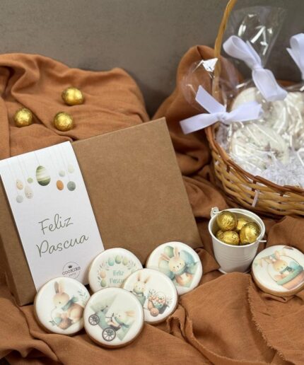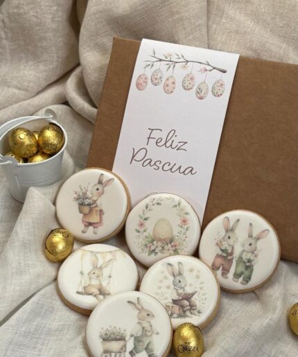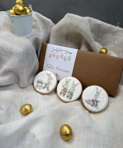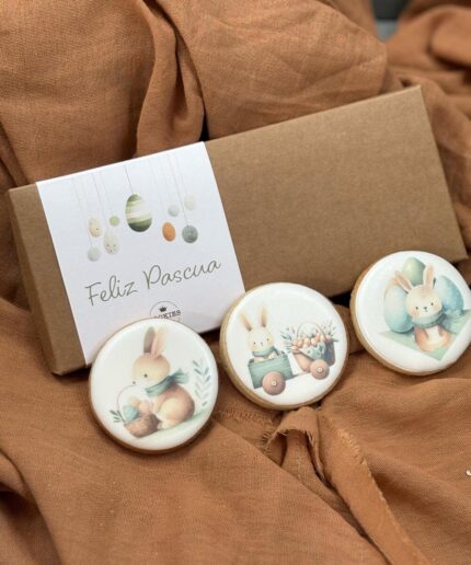 Se acerca SEMANA SANTA y es el momento perfecto para sorprender y regalonear a nuestros niños. Esta delicada caja de conejitos es el detalle perfecto para este día tan especial.Esta caja contiene 3 galletas de 5,5 cm con ilustraciones de Conejitos, todo viene dentro de una delicada presentación, nos preocupamos de cada detalle.Consejos de conservación: